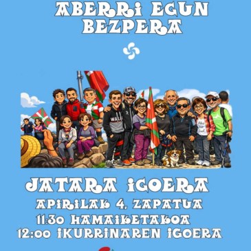 Apirilaren 4an, Jata mendian.- Urtero egiten dogun modure, bertan ospatu dogu Aberri egunaren bezpera ikurriñaren igoeragaz. Hamaiketako on bat antolatu eta gero, gure Jata mendi tontorreraino igon eta ikurriña jaso dogu. Gure ikurrina goi-goian ipini dogu, klandestinidadean egiten genduan lez, eta oindino egin behar dogun lez munduari esateko Euskadi euskaldunen aberria dala!! Aberria bizi!! Gora … More JATATIK MUNDURA. ABERRIA BIZI.